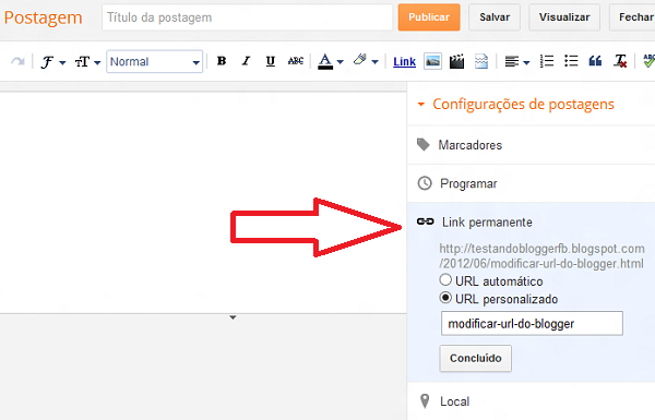 Mas agora o Blogger permite que modifiquemos a parte final do link, sem depender de como ficará o título. Ou seja, podemos reescrever o link, criando algo customizável, diferente do padrão gerado automático. Assim: